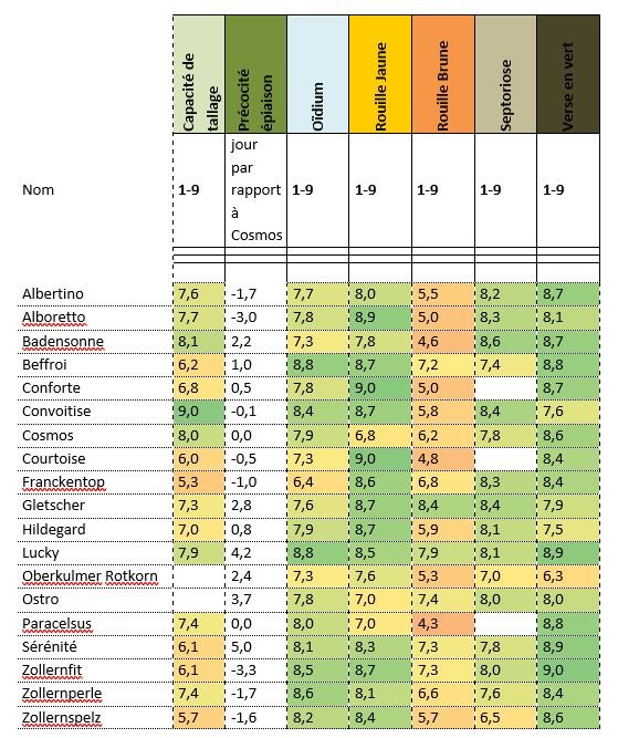 Tableau récapitulatif des principales caractéristiques agronomiques des variétés d'épeautres commercialisées en Belgique. Données issues d'une synthèse de 2022-2025 de la base de données de la Sélection céréalière (CRA-W).