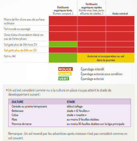 Selon le dernier PGDA, il est interdit d'épandre de l'azote minéral sur un sol considéré comme nu. En céréales, une parcelle est considérée comme sol nu tant que la culture n'a pas atteint le stade tallage. Concrètement, cela signifie qu'il n'est pas autorisé d'apporter de l'azote minéral en orge (ou autres céréales) avant le stade début tallage (BBCH21).