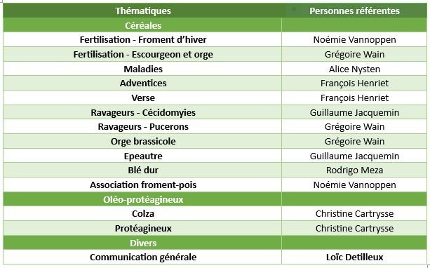 Depuis quelques semaines, les avertissements en céréales et oléo-protéagineux pour la nouvelle saison ont repris. Si vous souhaitez en savoir plus ou poser vos questions à l'un.e de nos expert.e.s, voici les différentes thématiques abordées dans nos avertissements ainsi que leurs référents. Vous trouverez leurs coordonnées dans l'annuaire ci-dessous.