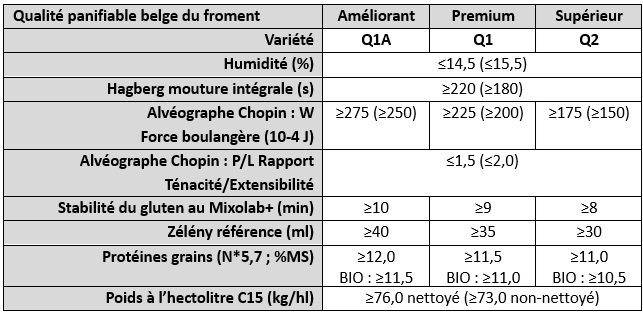 - Q1A (Froment panifiable améliorant belge) est de qualité panifiable semblable aux blés correcteurs en France et qualité E en Allemagne.