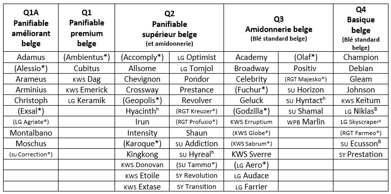 Il est également important de rappeler que ces fumures de référence en deux et trois fractions sont recommandées pour la conduite des variétés de froment panifiable belge supérieur (Q2), des variétés de froment à autres usages non fourrager (Q3) et pour les variétés de froment basique belge (Q4) destinées à l'alimentation animale. Vous retrouverez le tableau avec la liste des variétés reprises dans chaque catégorie ci-dessous.