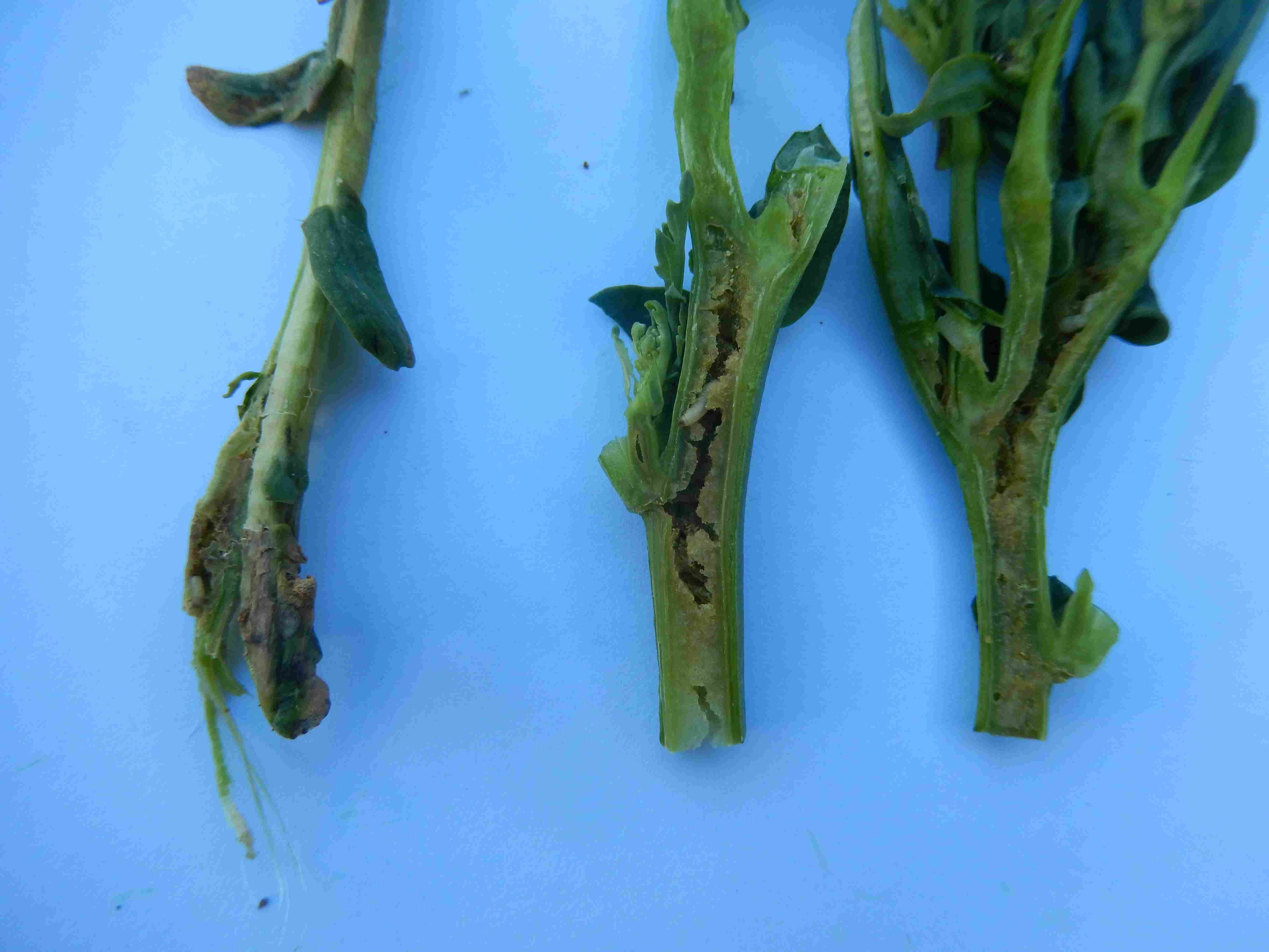L'arrivée en floraison dépend de la précocité de la variété (variété précoce, variété tardive). On peut cependant observer cette année, au sein d'un même champ, des différences marquées de développement entre plantes d'une même variété. Si la floraison est hétérogène, il faut vérifier la présence éventuelle de larves dans la tige de colza. Si les larves présentent une tête noire avec 3 paires de pattes, il s'agit de larves d'altise. Mais il est possible qu'il s'agisse de larves d'autres insectes (à déterminer).